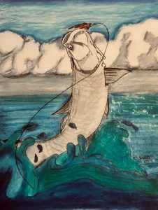 Dick K. jumped & landed an 80 lb tarpon, but there was no photo of the jump. When he got back to the Lodge, he drew his jumping Tarpon. Thanks for sharing, Dick.
